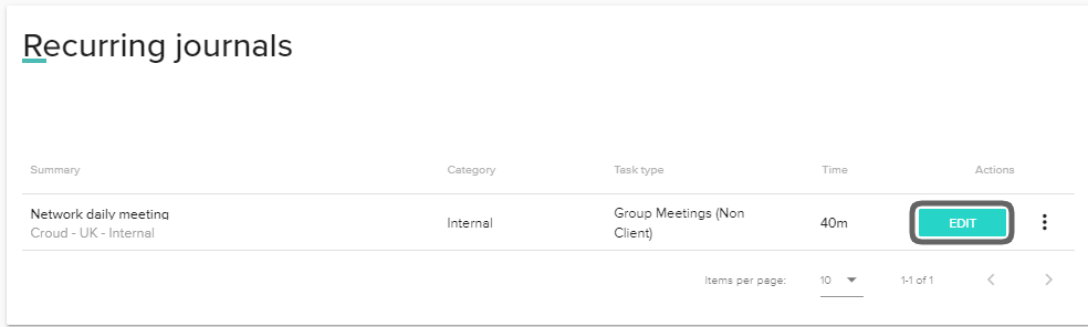 Any recurring journals that you have previously set up will appear in the ‘Recurring Journals’ interface. In the recurring journal you wish to edit, click on the “Edit” button.