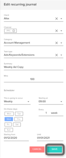 The journal slide out will then appear and you will be able to amend your recurring journal. After you have made your changes, click “Save”.