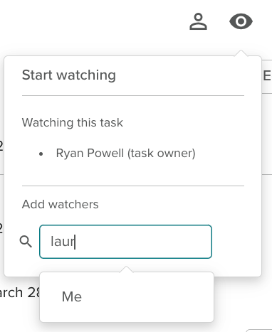 To add yourself as a watcher click on the eye symbol at the top left of the task you want to watch and enter your name. An option to add “Me” will show up.