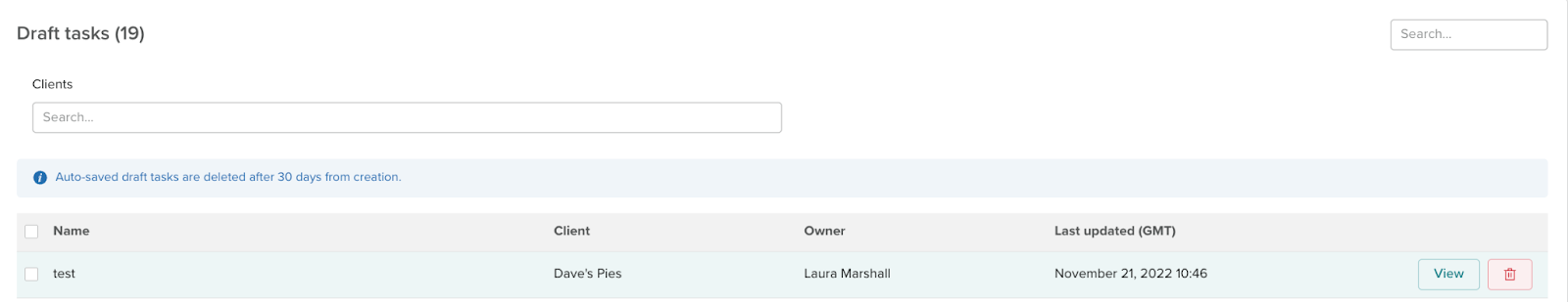 Click on the bin icon to delete a draft. Please note that auto-saved draft tasks are deleted 30 days after creation.