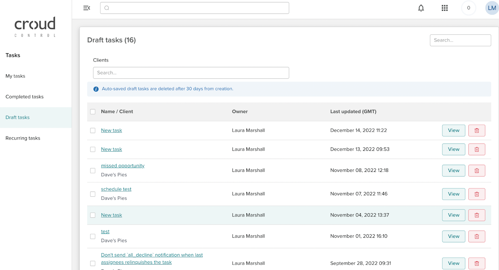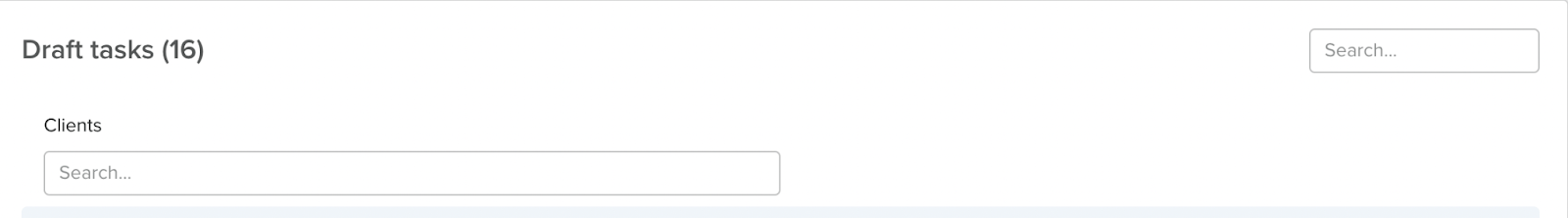 The section will display all draft tasks. Within the draft task section, you will be able to search for the task name as well as filter for clients.