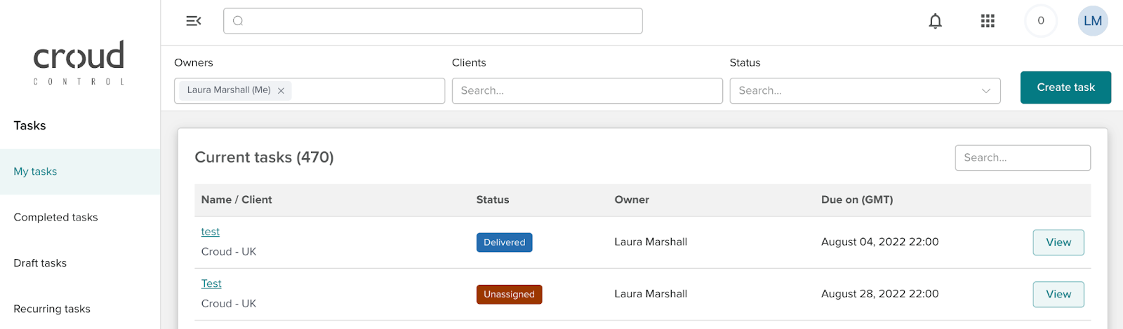 You will notice a filter has been added to the ‘Tasks’ page. The filter allows you to see the Open and In Progress Tasks owned by other FTEs. This is useful for when you’re covering holidays or sickness, or simply keeping a close eye on your team's workload.