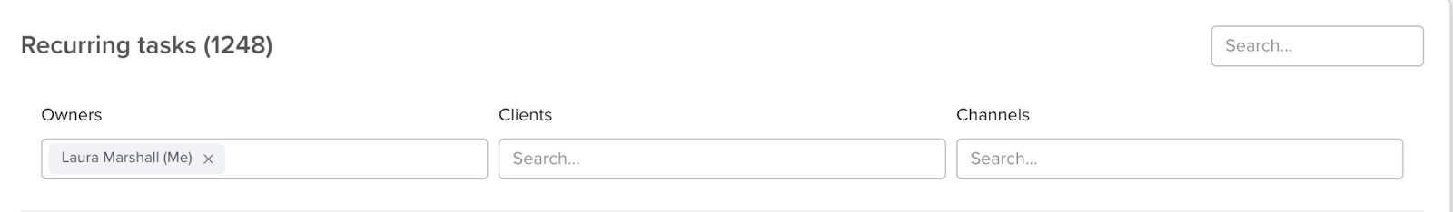 From within the ‘Recurring Task’ screen, you can also apply a filter to view recurring tasks belonging to other Croud colleagues. As well as filtering for other users, you can also filter by clients and channels. You can select multiple clients and channels.