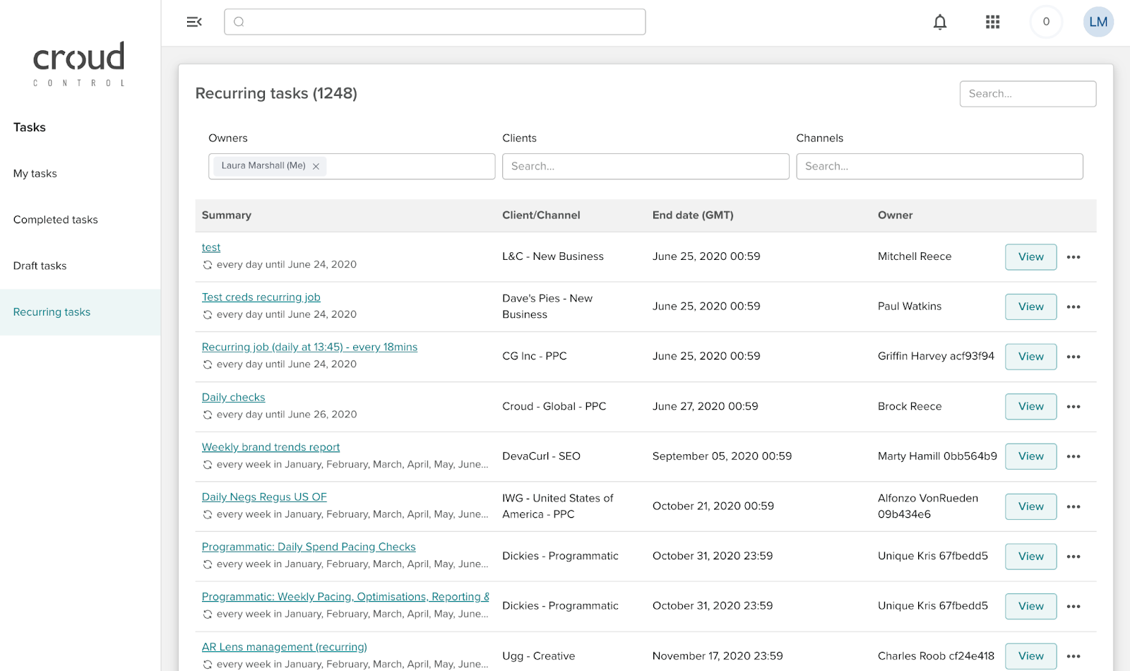 Within this page, you will be able to view the name of the recurring task/client and channel, the job owner and the date that it started.