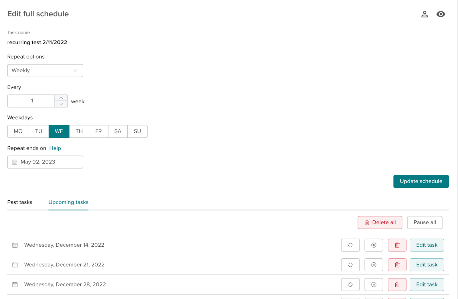 From this page, you can change ownership of a recurring task, add watchers, delete, edit schedule and pause schedule.