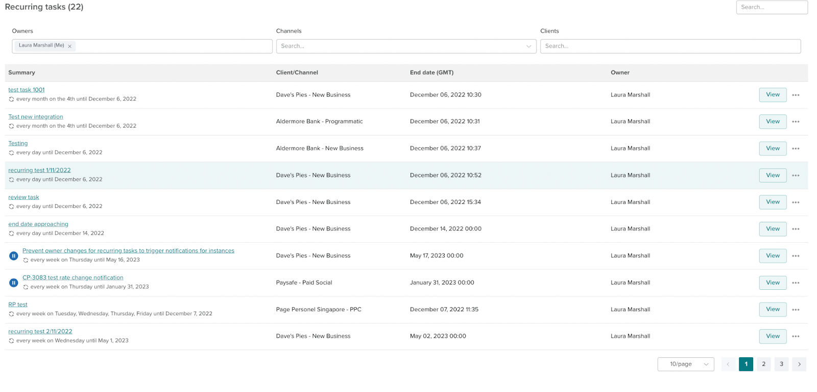 If you see a paused icon next to a recurring task, that means the task owner has paused the schedule, and therefore no new tasks from that schedule are being sent out. Next to each task, there will be a pause button to pause/resume every single instance. To pause a single task click the pause icon next to the task.