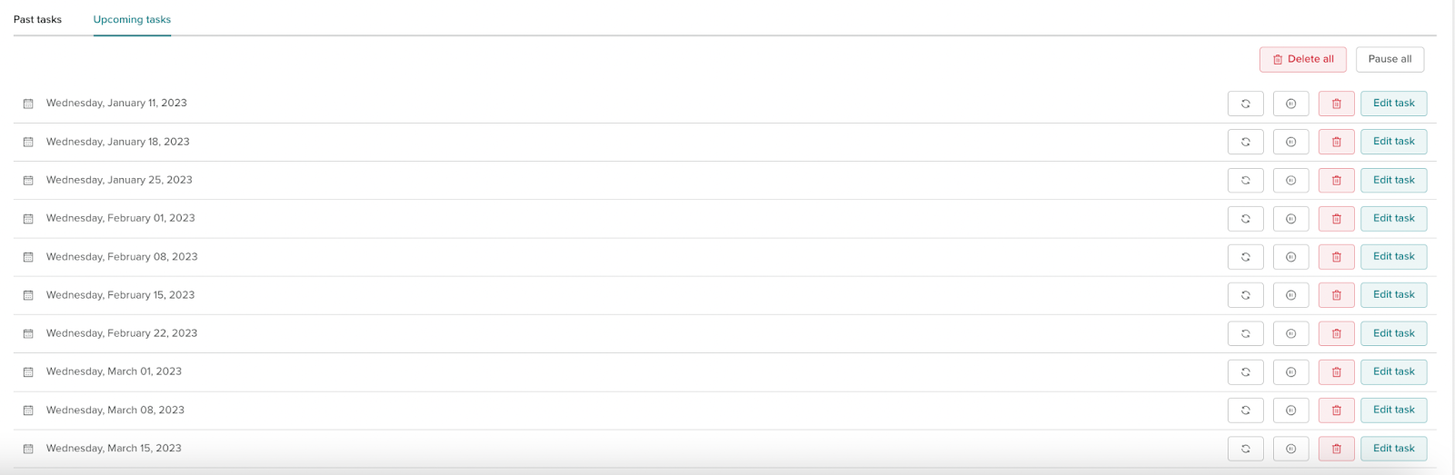 To edit the full schedule of a task, click on the view button next to an instance of the recurring task, this will take you to the full schedule page. From here you can see all instances of the recurring task.