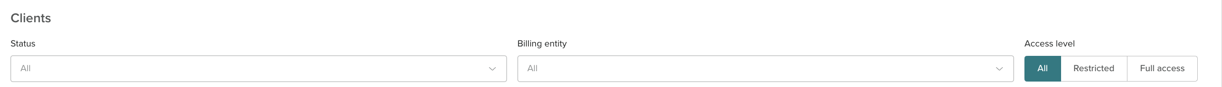 In Croud Control we use search filters, sometimes these filters may be the reason users cannot find clients. Remove all filters and try to search for your client if you are unsure of the status, billing entity and access level the client has.