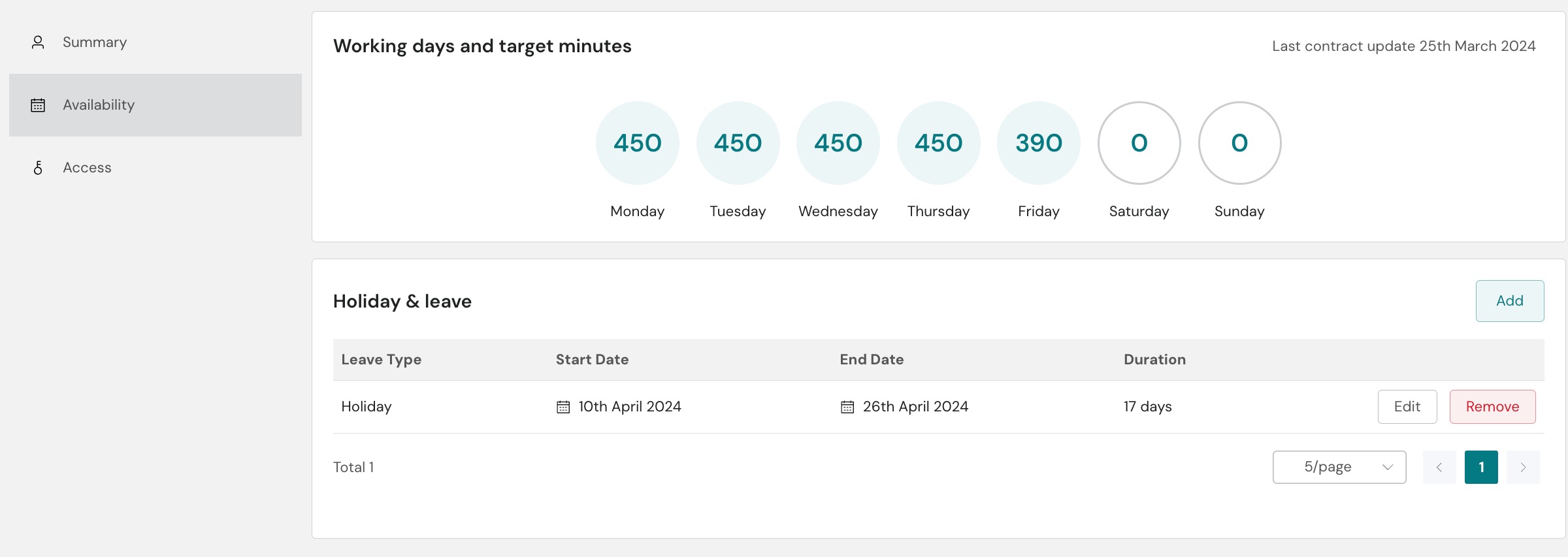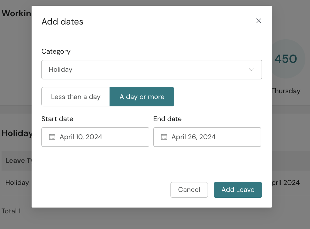 Next to the added leave is an 'Edit' option. Pressing this will open the 'Add dates' modal.