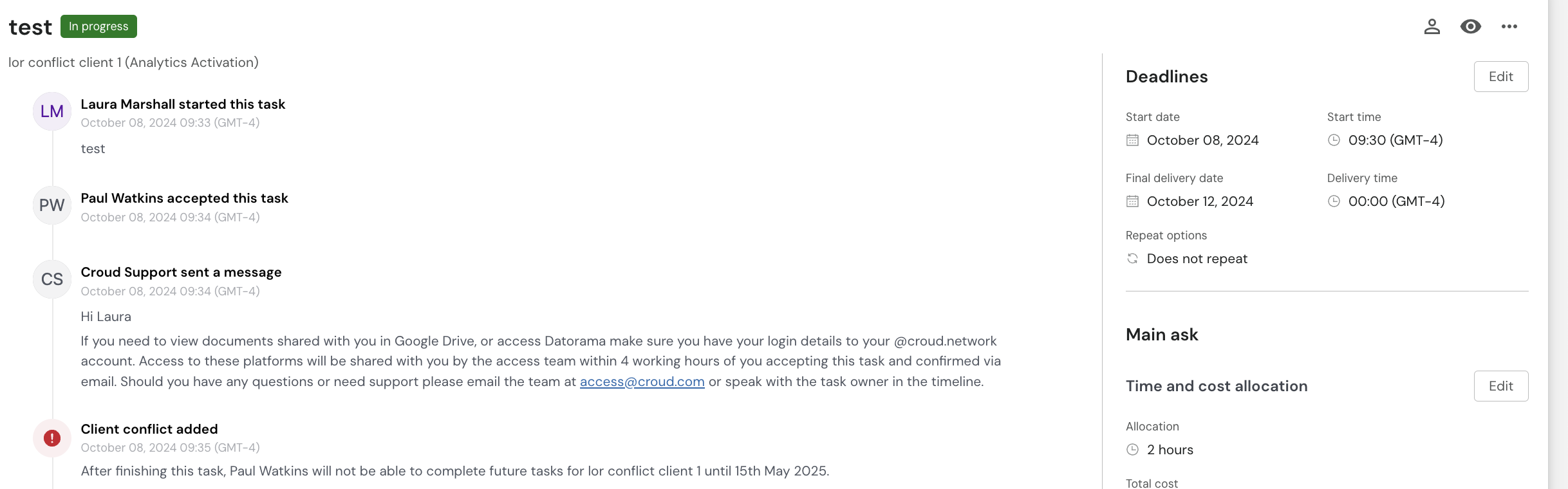 Yes, a Croudie can complete a task they've already started, even if they are about to be blocked. However, once the task is finished, the Croudie will be blocked from accessing the affected client's account. A timeline entry will also be added for both the task owner and watcher.